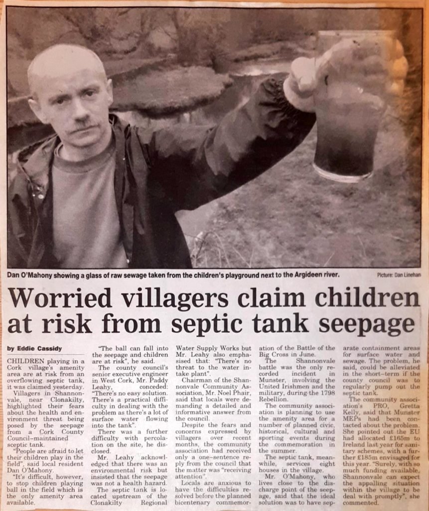 Following on from plans discussed at a residents’ meeting earlier in the month, one of the first tasks of the Shannonvale Sewage Flood action group, has been to raise awareness of the scandal in the wider media. With that in mind, Barry O’Mahony put together a brief explainer video for those unfamiliar with the fact that a sewer is leaking gallons of human excrement every day into the only public space in Shannonvale village. In the video, O’Mahony can be seen filling a pint glass with thick black sewage, simply by dipping it into the grass of what should be the village park. Later, while standing on the bridge that spans the adjacent River Argideen (drinking water supply for Clonakilty), and holding the offending sample, he explains that his father once, for the benefit of a newspaper photographer, stood on the very same spot 22 years previously, holding a glass of the same effluent, taken from the same leak.