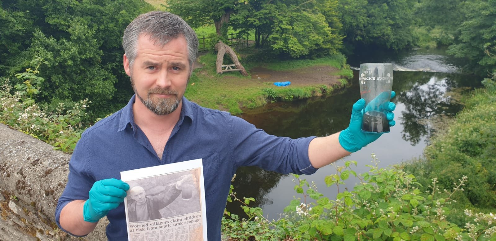 Following on from plans discussed at a residents’ meeting earlier in the month, one of the first tasks of the Shannonvale Sewage Flood action group, has been to raise awareness of the scandal in the wider media. With that in mind, Barry O’Mahony put together a brief explainer video for those unfamiliar with the fact that a sewer is leaking gallons of human excrement every day into the only public space in Shannonvale village. In the video, O’Mahony can be seen filling a pint glass with thick black sewage, simply by dipping it into the grass of what should be the village park. Later, while standing on the bridge that spans the adjacent River Argideen (drinking water supply for Clonakilty), and holding the offending sample, he explains that his father once, for the benefit of a newspaper photographer, stood on the very same spot 22 years previously, holding a glass of the same effluent, taken from the same leak.