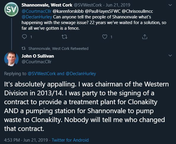 “It’s absolutely appalling. I was chairman of the Western Division in 2013/14. I was party to the signing of a contract to provide a treatment plant for Clonakilty AND a pumping station for Shannonvale to pump waste to Clonakilty. Nobody will tell me who changed that contract.”